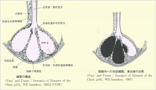 小葉は終末細気管支以下の領域、細葉は呼吸細気管支以下の領域。 細気管支から肺胞までのイメージ 肺炎と気管支肺炎 小葉の正常と細胞浸潤(肺胞性肺炎) [左]正常の小葉、明らかな小葉間隔壁に囲まれ中の蜂の巣様の1つ1つが肺胞、中は何もない気腔。中央の管状の構造は細気管支の断面。