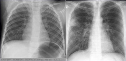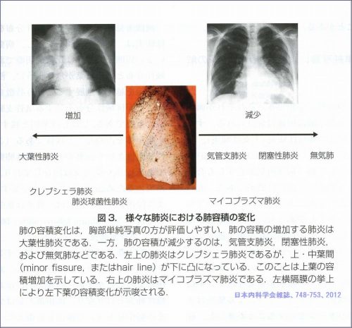 | 大葉性肺炎(肺炎) | 非区域性分布 | 肺容積の増加 | 肺炎球菌・肺炎桿菌・レジオネラ等 |