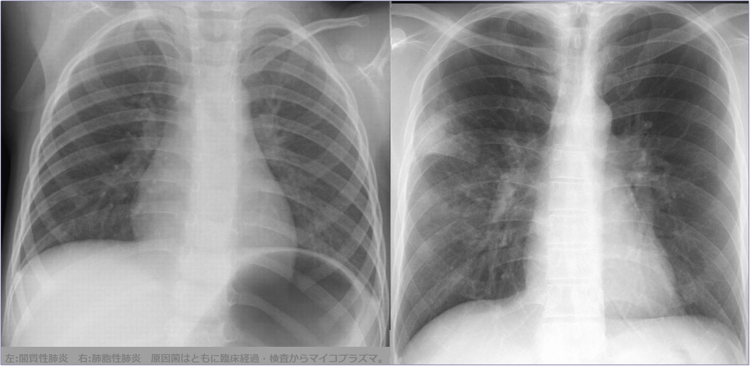 右肺下肺野では肺胞性陰影(浸潤影・airbronchogram)と間質性陰影(水平裂外側の下方への偏移・tram line・線状影等)が混在している。 [参考]右肺は均等影様にみえるが左肺と同じ透過性不良のすりガラス様陰影で間質性の陰影。 [びまん性肺病変の基本型] びまん性肺疾患 間質性陰影と肺胞性陰影