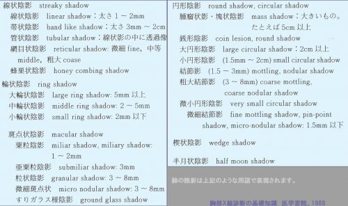 線状影・輪状影・網状影・蜂窩肺・すりガラス状影など