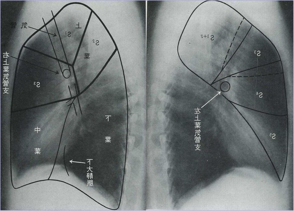 胸腺の腫大により気管が左右に変位することがあります。乳児では胸腺が正常でも腫大しているため、時にこの変化をみとめる。 [実際例] 気管が右に変位、同時に縦隔陰影の拡大があり肺野には気管支肺炎の所見をみとる。気管の変位の部位・変位の仕方で原因の推測が可能になる。 肺の分画 さらに細部をみると気管支の走行によって右肺は10に左肺は8つに分かれ、それぞれの区分に番号が付けられています(下の模式図ならびに実際に近いイラスト参考)。
