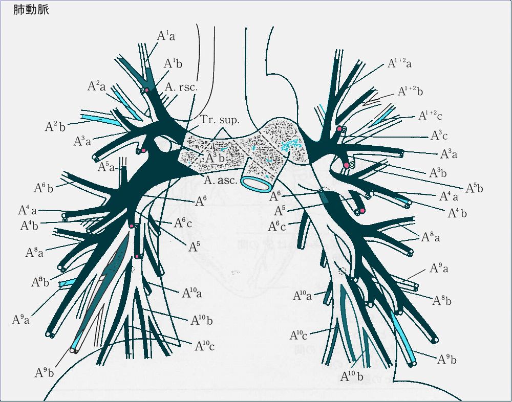 内側展開図(下図) 背面(下図)(背中側から見ている) 体表からみた肺区域 レントゲン写真に投影する肺区域 レントゲン側面像(展開像:魚の開きのイメージ) 肺・気管支のイメージ 気管支の分枝 肺の血管走行 肺門部のリンパ節 A-P window 大動脈と肺動脈の交差する部位、リンパ節腫大の目印になります。 肺野の区分 肺野を便宜的に3等分して肺野での位置を表示するために使用します。 縦隔陰影・心陰影 正常の胸部レントゲン写真像:チェックポイント 1.気管支B3bの断面とその内側の肺動脈A3bとB6(左)は必ず確認。